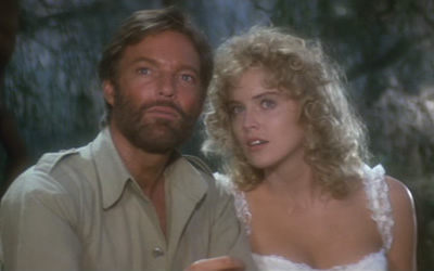 The main part of the movie starts and we see Allan Quatermain (Richard Chamberlain) and Jessie Huston (a young and really hot Sharon Stone) working their way through the jungle. We’re not even through the credits and we’re getting hit in the face right away with schtick between these two. She’s sassy. He’s overconfident. Ay ay ay… If there’s another hour and 35 minutes of this, we’re in real trouble.
