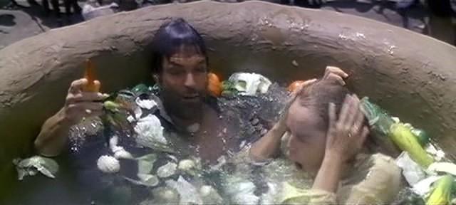 Next up, our intrepid duo find themselves in a village of tribe people who are cannibals. They dump them into one of those cartoony pots to boil them with vegetables. You know, stuff indigenous to Africa – corn, cabbage (grown in the bountiful desert that is their home), mushrooms, carrots, and tomatoes. They get out of it by tipping the pot over and rolling away. At this point, you start to see that real classic Cannon Films production values as it’s just an obvious tiny little crock rolling down a fake model terrain – a shot they use constantly interchanged with them rolling around on the inside.
