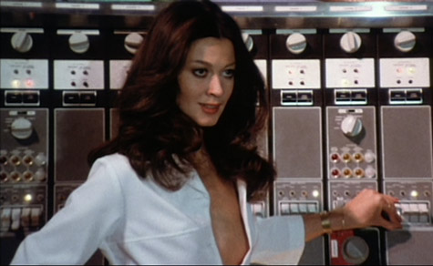Agar and Zorn go to lunch. Meanwhile, a guy on a motorcycle and his lady ride out to a field where they get naked and get it on in the grass. Bees start to be heard as if they are buzzing all around, and moments later, the guy is dead and the totally nude chick (except for her go-go boots) casually walks away. At lunch, Zorn tells Agar about the playboy club that the scientists have going on while we’re shown the biggest dump truck collection of gross men who I never want to picture having orgies. I guess they wife swap and fuck around on their spouses, and just generally prove to be disgusting men. Julie just says that scientists are no different than normal people, just more inventive. I don’t know what the fuck she means by that, but gross. At least we see our first glimpse of Anitra Ford’s character (Dr. Susan Harris) wearing pretty much only a short lab coat.