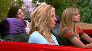 Less than 10 minutes into this movie, we’ve gotten to see the girls do cheerleading in two different scenes (individually during their introductions, and part of the whole group of cheerleaders from the school), one of the girls, Courtney, has been kinda hit on by a clumsy, dorky teacher, and a jock who she teases to the point that he pops a boner that sticks out of his open fly. At least I think this is what happened, but we don’t actually see it.