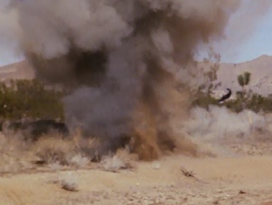 Okay. Look at that previous paragraph. That’s the crazy ass shit that fucking happened in this movie. However, it’s nowhere near as totally shitballs nuts as the next sentence I am about to write. When June and Cody see the bad guys waiting for them in the road, Cody is unable to avoid hitting one guy causing him to be tossed pretty far into the air and off to the side of the road where a live grenade in his pocket goes off, blowing him to bits.