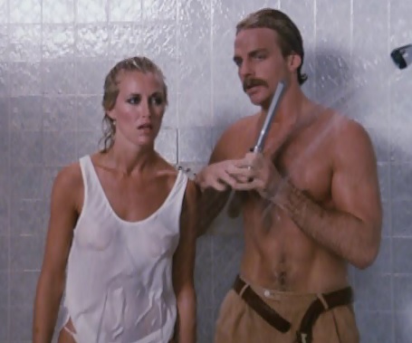 Cody, who looks like Aaron Rodgers if he was in a Saturday Night Live skit, I think, is supposed to be a funny, charming, good ol’ boy from Texas or something like that. However, he has NO charisma. I mean he is a fine looking man. Sure, by 80s standards, he belongs in a movie like this. I get it. However, he has so little on screen charisma he actually sucks it out of the other people around him too. At least that is going to be my way of saying we keep parading those tits on and off screen so no need to knock them for their acting issues. We’ll just blame our main star, Darby Hinton, for the lack of any real relationships between any two characters when he’s in frame.