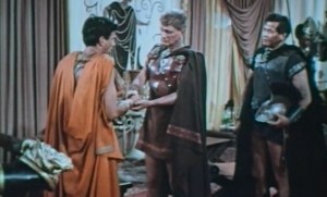 I admit, I really don’t know what the hell is going on here. Alexander found some dead guys. He got mad about it. He chased after some Persians and found Batman. Everyone thought he was dead, but he wasn’t, and everyone is throwing a party with some hot women and Joseph Cotten ruining all the fun. It’s no wonder this thing wasn’t picked up as a regular series because it’s gobbledygook. It’s just an hour of things and Greek names. Even when Alexander gives orders for something to happen in this turd, it’s just Greek names and orders spouted out by Shatner. He’s pretty good in this but there’s no real drive to the movie. Stuff just happens. Shatner says he wants to put an end to all wars by killing the Persian king, but John Cassavetes is resistant. Because he’s a traitor. But there aren’t any motivations. It’s kind of like a middle school play written about a paragraph on a Wikipdia page.