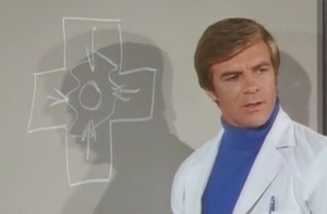 Okay, so people get brain machined and doing some word associations. James Best is giving some weird responses. Like he sees a girl in a picture looking at a lamp, and he says “ugly” and whenever he sees something that has to do with death (a skull, or a cemetery) he says “woman”. So he’s got some issues. The lady scientist leaves to get the other guy and points out that he’s not as comfortable with her as he is with another male.