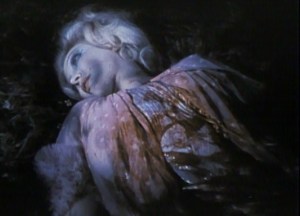 The next morning, Winifred gets a creepy look from Malcomb which she ponders for a few moments. She and Stein go back to work, but it’s not clear if when Eddie came back if he switched back to a less Blackenstein version of himself or not. It’s also unclear if he closed the door that Winifred left open or if they found that in the morning. They certainly are unawares that he’s been out killing and eating guts. Either way, that night, Winifred falls asleep in the lab while she is running some tests. Eddie Blackensteins out again and goes out for a little of the ol’ murder. He manages to sneak past Winifred who is just snuggled up next to her bottle of DNA.