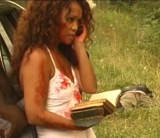 The following morning, Nashy, Steve, and what I can only describe as “the black friend”, since I never took the time to learn the d-bags’ names, go to Jennifer and Lupe’s house where a trap is laid for them by having the black friend’s sister waiting for them in what appears to be a precarious position where she is tied up and close to being hung. Of course, we know what is up with that because we saw her get bitten and what have you. Nashy, though, didn’t see that and is easily tricked by the ruse. When she tries to attack him, he’s forced to kill her by dragging her out into the sun and beating her to shit in front of her brother.