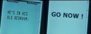 Sarah runs around the house and out onto the roof while getting help from her internet boyfriend. Not only do I despise the idea of a guy watching online in a feed that would have surely been delayed, but he’s also using a text message service from a computer that is not his own that I’m not sure was all that. Also, it types out each individual letter in huge font on her phone. Also, it changes font style when he has something really important to say.