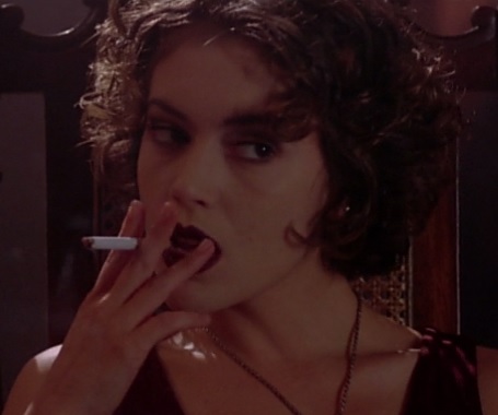 Chris is at the bar talking to his roommate about Charlotte and their conversation. Jennifer Tilly walks up and hits on Chris causing him to be tempted. Back at Charlotte’s dorm, she’s having a cigarette, because every time an Alyssa Milano character is about to have a sexual awakening, she has to have a cigarette, and thinking about what the vampire said about her becoming his. She goes into Nicole’s room and barrows a sexy dress and goes to a party.