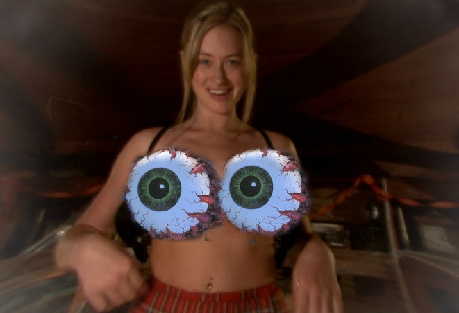 Kiana goes searching for a lollipop (because she mentions having a massive oral fixation), and finds a giant lollipop. The Killer Eye hypnotizes her to perform a striptease (thank you again, movie), So, Lauren Furs (for real that’s the name of the actress playing the school girl) pops her titties out again for us all to marvel at. She kinda gets the feeling things aren’t quite right, and snaps out of her trance. When she does that, the Killer Eye just kills her.
