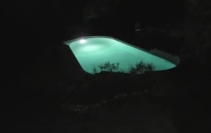 Rachel slowly approaches the pool in the backyard. She hears all sorts of noises around her but can’t pinpoint what they are or where they are. Things come to a bit of a head when she hears rustling and the moan near her. Soon, the moan is literally right in front of Jamie. She sees a ghostly woman and gets thrown into the pool where the ghostly woman holds her underwater trying to drown her. It’s interesting because the “camera” cuts in and out with some static sounds as if she was purposely wearing a camera. She isn’t. It’s almost like it is representing the life flickering out of her. She then sees the sky through trees like she is flowing down a river on her back and the sound of a laughing baby. The ghost story told earlier by the guys was that a lady drowned her baby in the river and haunts the river looking for unsuspecting people to kill.