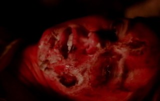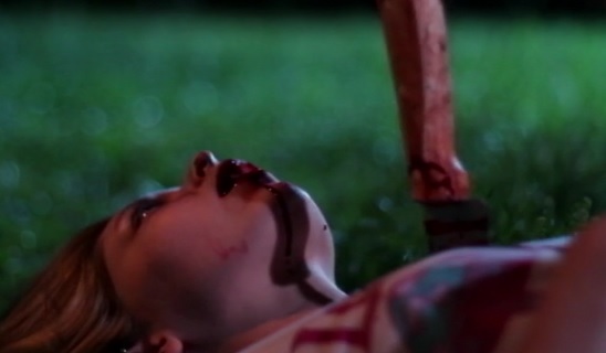 So it’s the night of the bonfire and Marissa is going to be “initiated”. One of the girls is ordered to spank Marissa on the ass four times with a paddle. You know, basic sorority/fraternity shenanigans. Marissa assumes the position and takes the spankings. One of the frat guys shouts out things like “Holy shit!” and “Bitchin’!” After Marissa gets her spankings, the sorority sisters spring this trap to spray her in the face with silly string. Surprised, she falls into the fire and sustains a massive burn to her face. When one of the frat guys goes to get help for her, he starts finding some of his brothers and the sisters from the sorority murdered.