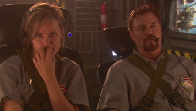 After looking over the crystal Radford found, Lake discerns that they are inside the Earth and not on the surface. There’s actually a fairly decent explanation of it. While I will always doubt the scientific accuracy of any Asylum movie, what Lake says about what the crystal is, where they are, and the fact that they are also underneath a few dozen kilometers of molten lava all seems to probably check out. I’m too lazy to look it up, but it sounds kind of intelligent. At least a little more intelligent than the whole Deep Digger/Penis Pounder thing Emily and Harnet is using to rescue them.
