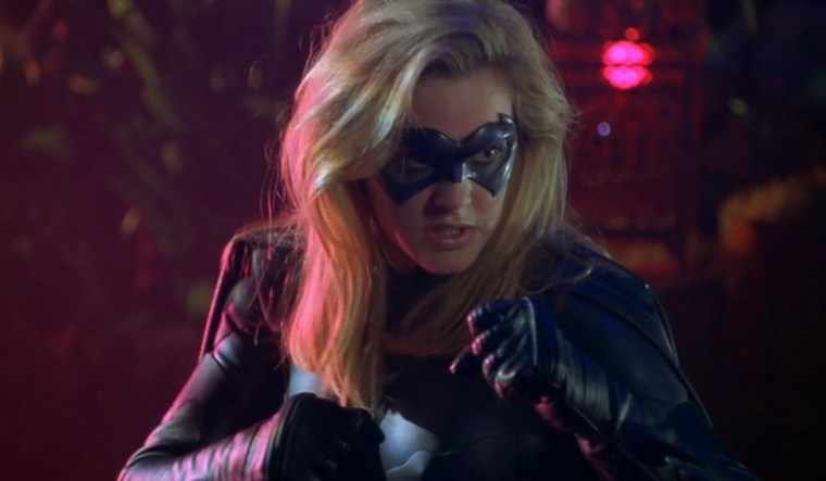 Meanwhile, Barbara figures out the password on a CD that Alfred asked her to give to his brother in India. That unlocks all the secrets of Batman and Robin in a neat little animation that is goofy as shit. Batman and Robin go to fight Freeze, Bane, and Poison Ivy who have taken over the Gotham Observatory to freeze the whole city. While they are off to do that, Barbara finds her way into the Batcave where a computerized Alfred welcomes her and tells her he’s prepared her a Batsuit. Not sure when he ever would have had the opportunity to craft her a skintight Batgirl suit perfectly set to her measurements, but whatever. No. Not “whatever”. What the fucking fuck? So she, without any training of any kind, aside from the ability to drive a motorcycle super fast, is now a superhero? At least Dick was an acrobat with enough muscle and pluck to win in a fistfight. She has nothing. She still talks like a bimbonic piece of jail bait. Oh… Wait. That’s her appeal here.