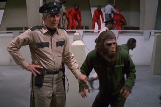 Caesar’s hiding doesn’t go all that well, though. He hides himself in a cage with Bornean orangutans – the first and only time these are seen in the original Apes series. But that cage is sent directly to a training facility loaded with other apes and cops. Maybe he ain’t so smart after all, eh?