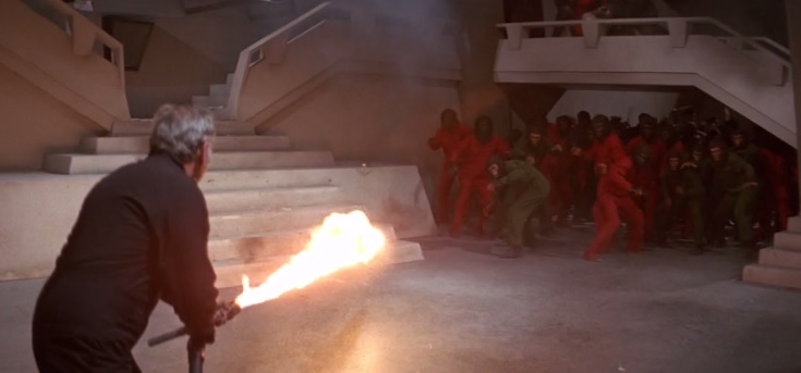 This revolution scene is like twenty minutes long and features lots of apes beating the utter shit out of people and lots of apes being gunned down by people. It’s a brutal scene. It was also the reason why this was the only of the original Apes movies to be rated PG as opposed to the G rating the others had. Additionally, there had to be an edit made to the beginning to cut out a scene of an abused ape being killed by the police after he murdered his owner in revenge. It’s a long scene of all out war.