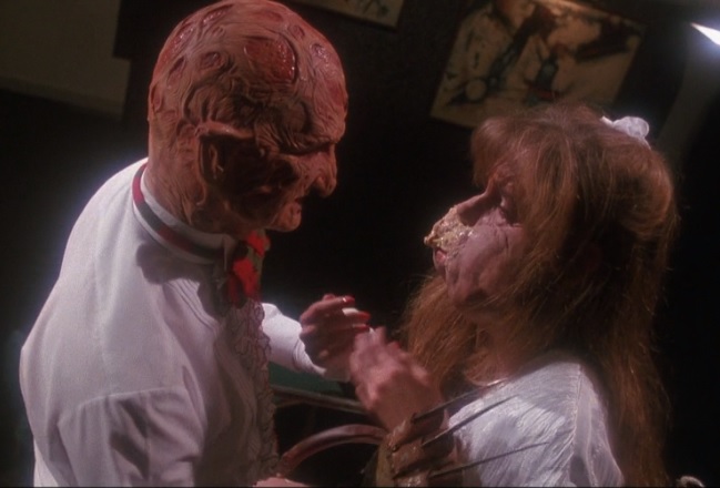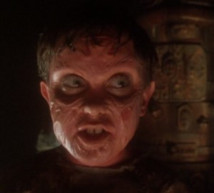Alice follows Amanda inside the asylum and we’re treated to yet another scene of Lisa Wilcox just walking down corridors. This movie is not even 20 minutes old and we’ve seen 42 minutes of creepy asylum halls and Alice looking cautiously around for a nun she’s followed into this situation. Alice witnesses Amanda giving birth to Dobby the house-elf who runs out of the delivery room to, I assume, dissuade Harry Potter from returning to Hogwarts. Alice, seemingly unfazed by this fucking gross creature, follows it into a church where it crawls into that signature sweater and grows to regular sized Freddy Krueger. He reveals, by feeling up Alice’s belly, that he’s found a way to return to life (indicating that she will give birth to him). When Amanda comes in and says something about how his birth was a curse or some such shit, he calls her a bitch.