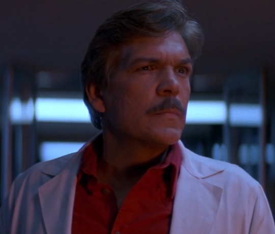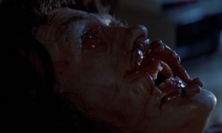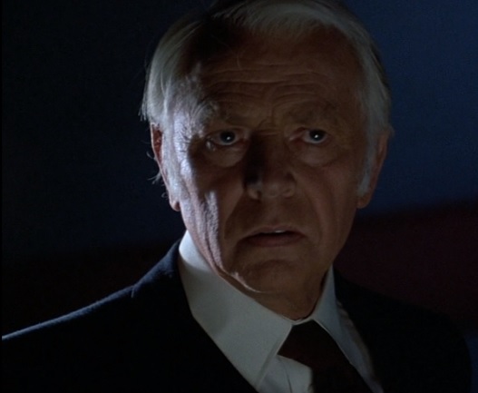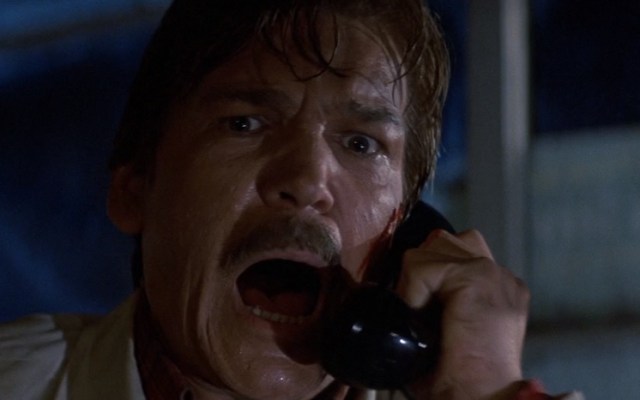 The man is checked over by Dr. Dan Challis (Tom Atkins). When the man is unnerved by a Silver Shamrock Halloween Mask commercial, he tells Challis that “they’re going to kill us all” before given a sedative to make him go to sleep. Once stabilized, one of the well dressed guys on the chase from the beginning goes into the man’s hospital room and kills him by sticking his fingers in the guy’s eye sockets and crushing his skull and brain. A nurse finds the attacker who calmly walks outside, douses himself with gasoline and lights himself on fire causing his car to explode.
