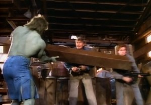 At the lab, Banner realizes something is up and he’s confronted by some of Jack LeBeau’s (Thomerson) men who are there to take the transponder and Banner. In the struggle, the Hulk is unleashed and chases away the thugs. LeBeau decides that if Banner proves to be a problem, then they need to go after Maggie Shaw. They go to her place to kidnap her and despite Thor and Hulk both being on the scene, they do succeed in taking her.