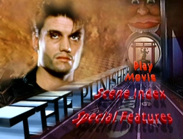 There’s billowing fire behind what appears to be an airbrushed Dolph Lundgren in order to make him look more like Sylvester Stallone. There’s a craps table that leads to some sort of juggling clown statue in a Buddhist temple. “The Punisher” is also reaching into the distance. The menu itself is made out of bad 90s computer effects, but worst of all… It doesn’t keep the same perspective as the rest of the image. It’s like Special Features, Scene Index, and Movie all stay parallel to the craps table, but then Play ramps up as if it is deciding to take off and leave this menu behind. I kinda feel like this is what you’re shown by a mad scientist trying to experiment on you to drive you insane.
