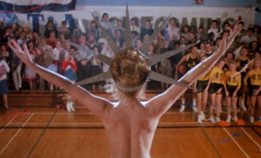 There’s one final plan up the guys’ sleeves. They are going to line Purity’s dress with metal and then use magnets to make it drop at the homecoming pep rally. I worry that this will end like Carrie with them all getting totally fucking murdered by the evil sociopath chick. But who am I kidding because I love it when a good plan comes together and it certainly does here. Purity sings the National Anthem and, at the conclusion, Howie flips the switch and off comes the dress in front of the whole school!