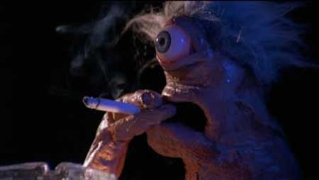 The main demon monster guy summons all his little cyclops monsters to help him remove the human who dares enter their home. All these little cyclops start appearing. One of them has a smoking habit. No shit, one of these little cyclops puppet things is tokin’ on a smoke.