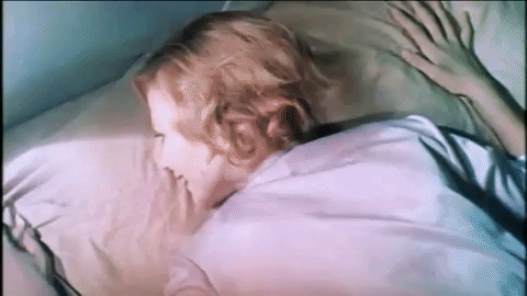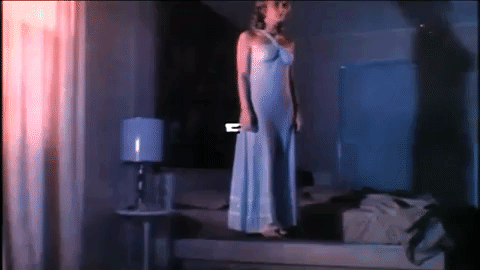 She starts acting a little crazier and, for shits and giggles, decides to toss an ashtray into Robert’s really nice aquarium killing all his giant goldfish. Seeing how this is an Italian film and Italian filmmakers are known for killing animals in their movies, I suspect those fish died horribly while drowning on oxygen. That night, a heavy breathing ghost monster pulls down the blankets over Jessica and that goofy floating thing happens that I showed above. However, it seems that she does more than just awkwardly floating off screen, she got her jacket, she went all the way the fuck outside, apparently took a swim, and then walked all the way home to a concerned Robert who, like anyone else watching Beyond the Door, really noticed that really weird special effect of her floating away.