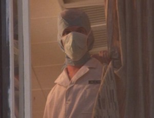 But when we see the, she’s in her office waiting to hear from Barbi and has those little paper slippers on over her shoes like she was in surgery.  That’s not right.  I mean, yes, some physicians perform surgeries, sure.  But usually, that would be done in rare situations and probably not on a day in which people would expect to show up and get lab results and whatnot.  On top of that!  She goes to the 9th floor where she was called by murder man and wanders about on a floor that is utterly wrecked and full of fumigation smoke.  She continues to search around for who knows what.