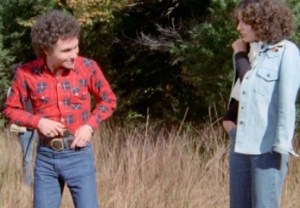 Our movie begins, we get a little lesson about Yin and Yang as it pertains to women and men. *shrugs* Okay. Anyway, a girl is walking through a field and somehow stumbles upon Ispitonyourgravesville where a few guys who might be camping or hunting or possibly just walking around with guns and shit come upon her. One guy is a giggling mess of a creep. One of the guys is Jamie Gillis who was Dracula in Dracula Sucks. So, there’s that. But the girl slips away from the creeps and the giggler shoots her as she runs away.