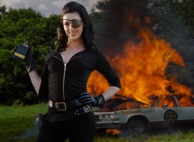 This is a really difficult movie to write about, honestly. This movie has a mess of kooky characters and a whole bunch of scenes. I said earlier this movie had to have a thick script. The movie is over two hours long with dozens of characters seeing screen time. You’ve got a cop-killin’ femme fatale, undead bikers, an evil scientist, a back-stabbing henchman, strippers, pussy farts, a guy who shoots himself in the head until he has no head, a guy with a plate in his head that won’t die, a chainsaw wielding preacher, a tranny kung fu artist, a kind of literal Bride of Frankenstein, topless henchladies, a monster, bunch of tits, a girl covered in blood who spends the entire movie wearing only her panties, crazy ladies, a guy in a swastika shirt, a severed head giving, well, head, a guy’s head who gets caved in by a monster stomping on him, a guy’s head cleaved in half by his own chainsaw, and literal skull-fucking.