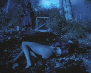 Elsewhere, a blonde with huge tits is posing for a photoshoot with a real creep of a photographer. The photographer has a client who likes pictures of girls with costumes and, I guess, a morbid flavor. Despite her protest, he makes her pose with a mannequin that I think is supposed to be a dead body or something. Whatever. She gets paid with a $100 bill with an axe stamped on it. She was followed to the building where the photo shoot was, then, as she gets dressed, the same footsteps go to the room where she is and is revealed to be a hooded dude with an ax. She gets chopped down.