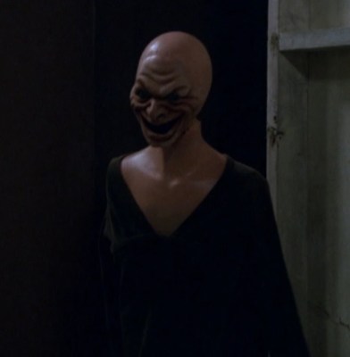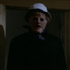 Molly says he’s killed her friends and they need to go to the police. Slausen doesn’t seem too hip to that idea, but agrees that he can go get the police but he needs to go back to the house and lure him back there so he will be in that one location when the cops come. He is going to go into the house and set the radio in the window to lure Davey home. He gives her a gun to protect herself. When she sees Davey she fires, but the gun is only loaded with blanks. She hits him in the head with the rifle, breaking the mask, revealing that Mr. Slausen (surprise!) is Davey.