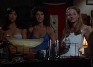 In fact, this movie has whatever flavor lady you want. Jocelyn Jones, while not always playing this type in other 70s movies, is the good girl. She’s all sweet and kind of naive and innocent with her white dress and bonnet and braids. You’ve got curly headed, and slightly higher maintenance, Robin Sherwood. Later, we’ll see Dawn Jeffory as Tina, who is a little more like Tanya Roberts seemingly easy-breezy chick, but perhaps a little younger.