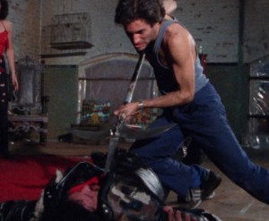 Alright, enough bullshit. This scene turns kind of amazing. So Mad Dog has his bitches give Dana a makeover so she looks like one of them. He then tells his dudes to take her to be “initiated” which is scumbag for “super raped”. Trent doesn’t have none of that shit. he challenges Mad Dog for dominance. He first demands to know the rules. Mad Dog doesn’t believe in rules, but lays it down – kill him and Trent makes off with the girl and if Mad Dog kills Trent, what does Trent care what happens next? Now, this is where it gets really awesome. Trent adjusts the rules by saying that if he wins, he gets the girl and Mad Dog owes him a favor. Mad Dog says no way to that shit, but Trent says if he doesn’t agree, he won’t fight. He eventually relents by saying, “Alright alright… If you kill me, I owe you a favor.”