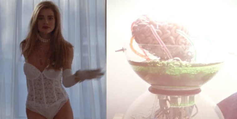 But, that is not how it really goes down. Somehow Michael’s brain was preserved and it now lives with Tammy. Every day, she comes home, pours alcohol into a tray where his brain is soaking in brain juice, and she uses a camcorder for him to see her. She is researching bodies for him, but what’s more, she dances for him in sexy lingerie until his brain begins to smoke and spark.