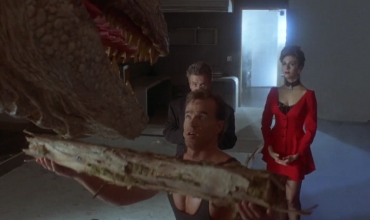 Smash cut to Terry Kiser checking on his dinosaur creation with his hot babe, goon, and science dork goon. He has the dinosaur there, and his people show off what it can do. It’s super strong. It’s got super sharp teeth. He’s got the ferocity. It doesn’t have a brain. That keeps it stuck in the warehouse where he was I guess “built” or “created” or whatever.