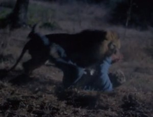 Michael doesn’t want to run from Billy, but she doesn’t want her parents to know he was there. By the way… With Billy and his gaggle of fuck nuggets rampaging through not just the town but Tammy’s parents’ house, how are these people NOT in jail? I do kind of feel like Billy is definitely showing his credentials to someday make it to the Supreme Court. Michael runs but is eventually caught by Billy and gets his ass handed to him again. Instead of dealing with Michael with his own two hands, he loads him up in his trunk and takes him to a “Wild Animal Park” so he can be mauled by a fucking lion.