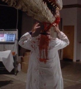 The T-Rex wakes up and realizes that his brain is no longer in his body. While the assistant ridicules the T-Rex, Michael decides he’s had enough of that shit and bites his head off. When the muscle-bound goon comes in and threatens the T-Rex with karate, Michael kicks him out of the warehouse and steps on him, killing him. Outside the warehouse, a little old lady is on the phone reporting what she’s seeing to the disbelief of (not her husband but) her horse betting bookie on the other end of the line. That’s when the T-Rex approaches her…
