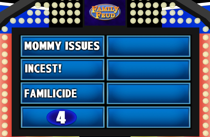 Okay, so that does solidly explains why he’s damaged.  Also why he uses a straight razor.  Also why he gets mad about the guy cheating on his wife in his father’s bed.   When she slaps him around a little bit for acting on his own, he strikes her and that pisses her off real bad.  She calls him sick and a momma’s boy.  Angelina claims she was a drug-addled alcoholic.  Angelina calls him pathetic but also tells him to come to momma, so she clearly knows how to at least try to control him.  As for her damage?  She’s angry.  She was sexually abused by their father and their mother didn’t do anything about it – or maybe didn’t even believe her.