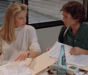 Finally, Stacy gets phone records back to discover party line calls.  I should say that the movie does build in the excuse for not having these earlier on the “computer being down again” but at least now Stacy and Dan, who pulled an all-nighter and super hot on the idea of catching his girlfriend’s killer, have leads.  I do admit that now the cops have a way to catch the murder siblings, they do come off quite competent.  It just took us a long time to get here.  More on that in a bit.