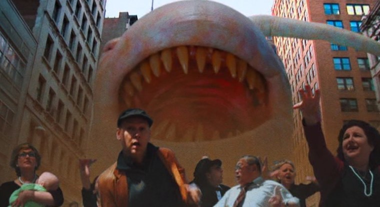 Wadzilla first attacks a girl’s dog before biting her head off. Later, Wadzilla attacks a pair of homeless people. and it has already grown significantly larger. Louise and Munson go on their date and she is understanding of all this stuff with the giant monster sperm creature and what have you. They see a report on the news about the “tadpole like creature” is already the size of a house and growing. The next day it is rampaging through New York and leaving nothing but death and devastation in its wake.