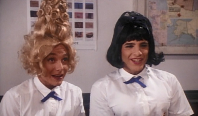 The girl they meet, Maggie (the super cute Michele Matheson), agrees to help Naldo and Vin. They have no idea what to do. They hope Maggie has some ideas. Maggie does say she knew Swales was kind of a hard bitch with delusions of grandeur, but had no idea how far her aspirations reached. It’s too late that first night to figure out exactly what to do. So they have to go to class with Maggie. However, with the school being all girls, they have to do this Bosom Buddies style and dress as girls. They are surprised to see that Maggie’s teacher is Dr. Dorn. They also see Swales who comes in asking for a report from Dorn about the girls.