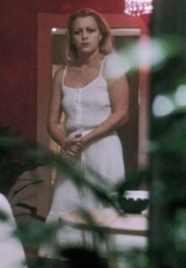 Or… Or she could go outside to see who might be around peeping in windows and shit. Yeah, that works. This is what smart, hot, blonde babysitters should do in horror movies. Now, despite this being a really solid plan on Kathy’s part, she gets attacked by a guy jumping down from the roof of the house. Again, George Tatum wakes up from a nightmare in New York. In Florida, the cops look around to see what all the hub bub is about this hot babysitter who got attacked. Surprisingly, Kathy is still alive. She’s traumatized, but alive. One of the little kids she was watching creepily giggles at how scared Kathy is.