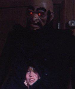 As Kathy showers, we see someone has been lurking around and has even come into the house. This leads to yet another wonderful reveal. Kathy has been in the shower. We’ve tracked this potential intruder outside and now inside. He’s coming up the stairs while Kathy is drying herself off and going into the medicine cabinet for some cream or something. When she shuts the sliding mirror door, there’s this strange looking mask thing staring back at her with glowing red eyes. It turns out to just be that little turd CJ and this is what he was working on in his room.