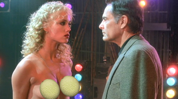 Anyway, Cristal comes by to watch the girls dance. The producer tells Nomi to play with her tits to make her nipples hard. She tries pinching at them but he brings over a bowl of ice. She angrily knocks it out of his hand and runs off. Nomi figures out that Cristal got her the audition and Cristal says that maybe she likes how Nomi dances. Again… Nomi is a fucking stripper who licks the pole, makes Kyle MacLachlan cream his jeans, and tears Penny’s panties off her body. Why is she so up in arms over this? Okay, she’s angry that she thinks people are treating her like trash and humiliating her. But… Again… Robert Davi is a total pig to her and the other dancers at the Cheetah.