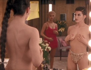 Six weeks pass, and Nomi and Molly seem pretty close. Molly invites her backstage at a show called Goddess. Here, she watches the lead dancer, Cristal Connors (Gina Gershon). She’s dazzled by the backstage antics and the show itself. I’m dazzled by how many times the characters say the word “snatch” in this scene. They didn’t even try to mix it up with words like beaver, or clam, or muck gutter.