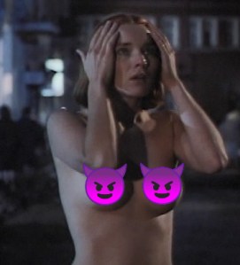 She and her loyal Hell dog go to Satan’s Asshole, and like a turd moments after a Taco Bell dinner, she squeezes her way out whether it wants her to or not. There’s a problem, though. She has little horns, wings, and a tail. She’s going to stand out now that she’s come up through the sewer where Devil’s Asshole, appropriately, lets out at. So the movie does us a solid by giving me a solid and she transforms into a human – a naked human.