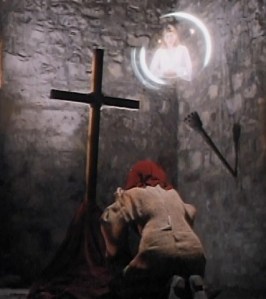 We get to see a pretty decent portrayal of what Hell looks like and what life is like there. Lots of screaming, anguish, and fire. These guys walk around with cages on their heads and others look like they are into some pretty kinky leather shit. Guys are getting beaten and whipped. There’s this set of half dozen faceless guys whose heads just shake out of control. This is a fun little opening scene.
