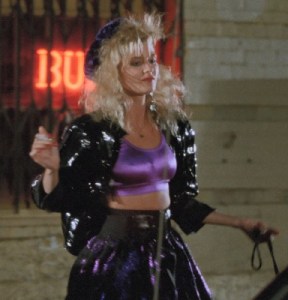 Our movie begins with some suspicious shenanigans outside a truck stop diner. It’s a coke deal. The buyer says it is top grade shit and he can make a killing off it. The seller says he can get as much as he wants because he has a new source. Just then a blonde babe pulls up and says she’s lookin’ to party (true fact: ALL blondes in the 80s were looking to party, even outside a closed diner). They say there ain’t no party here so she should just beat cheeks. She comes up with another idea – make their own party. She turns up the radio and dances her way over to the drug dealers’ car. She shows a giant roll of cash to buy her own party.