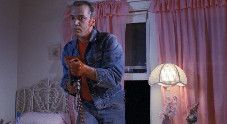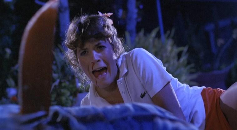 Things do start to head downward for the party. Diane gets convinced by her boyfriend to leave with him to go back to his place so they can play a couple games of grab ass. She has to make the awkward revelation to her friends that she is leaving this party that was meant to just be the girls for “old times’ sake” to go off with her boyfriend to do things that, clearly, has caused these types of slumber parties to need to be set up this way to celebrate old times gone by. when she gets back to the car, her boyfriend loses his head (literally) and she is chased around the garage by Russ until we see a shot that turns out to be relatively iconic and used often in advertisements for the movie.