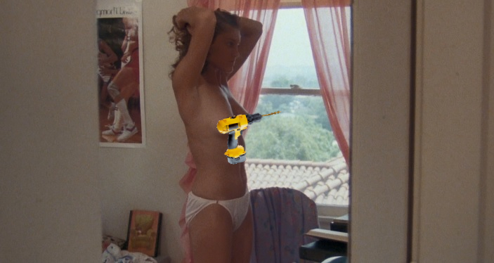 Inside the van, the girl is drilled by our slasher killer’s favorite weapon of choice, a giant power drill.